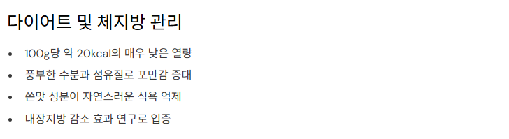 - 열량이 매우 낮고(100g당 약 20kcal), 수분 및 섬유질 풍부