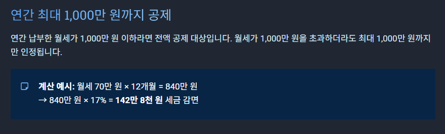 - 즉 연간 월세가 1,000만 원 이하라면 전액 공제 대상이 됩니다.
