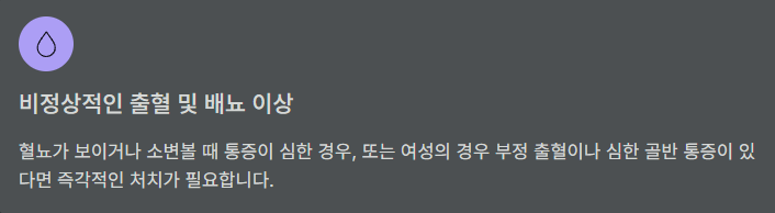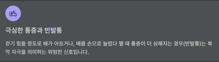 - 동반 증상 확인 — 발열, 구토, 배변 변화, 소변 이상, 여성의 경우 생리/출혈/분비물 변화