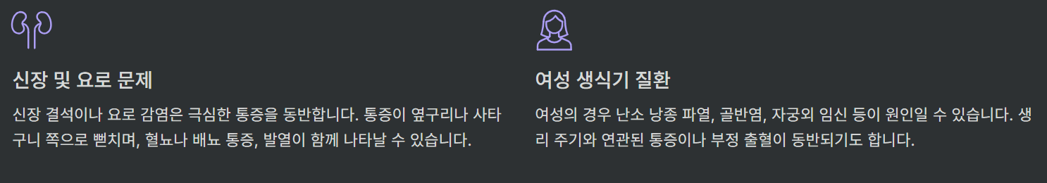 - 신장 또는 요로 문제 — 신장결석, 요로 감염 등으로 인해 옆구리나 아랫배, 골반 쪽에 통증과 함께 소변 이상, 발열, 메스꺼움 등이 나타날 수 있어요. Firstresponsehealthcare+1