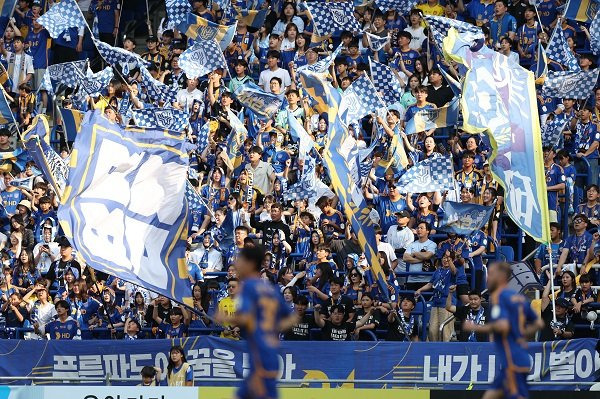 울산의 팬들은 언제나 팀을 위해 열정적으로 응원합니다. 경기장에 모인 팬들은 팀의 색깔인 파란색과 흰색으로 가득 차 있으며, 다양한 응원 도구를 사용해 팀을 지원합니다.