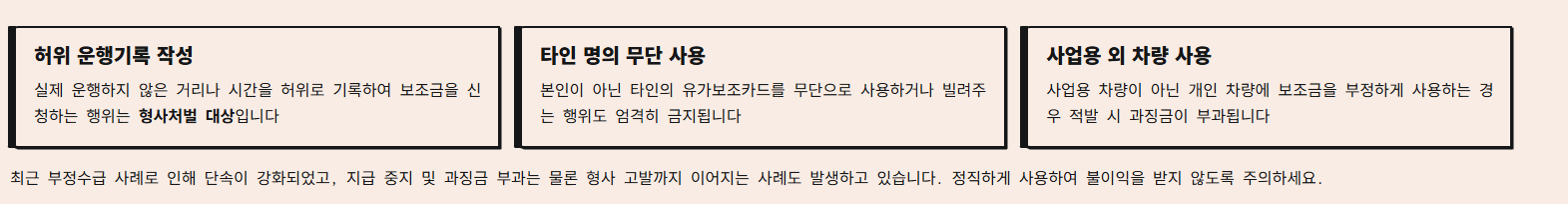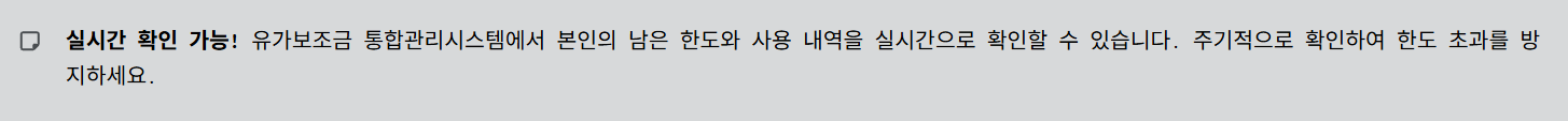 - 초과 사용 시 보조금 미지급 → 통합관리시스템 내 실시간 확인 가능