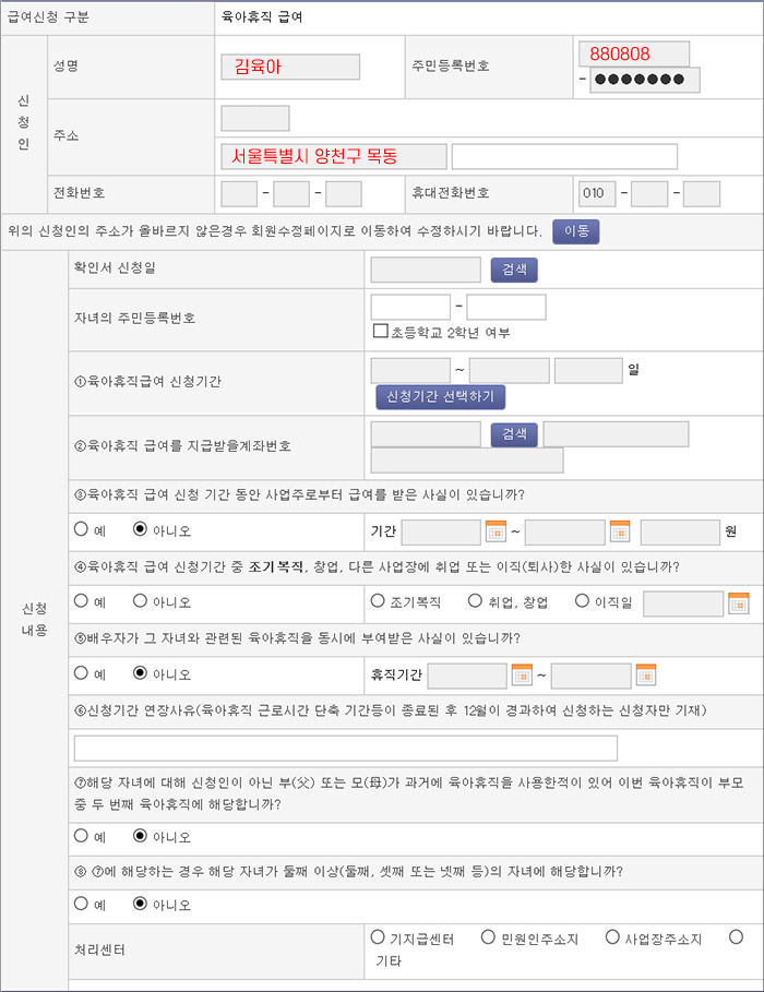 - 급여 신청 : 육아휴직 급여를 신청하기 위해 추가 서류를 제출합니다.