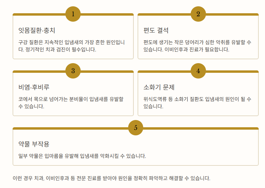 입냄새가 양치질 등 기본 관리에도 계속된다면 아래 원인을 생각해볼 수 있습니다: