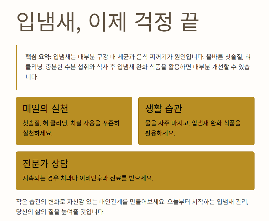 📌 요약: 입냄새는 대부분 구강 내 세균과 음식 찌꺼기가 원인입니다.