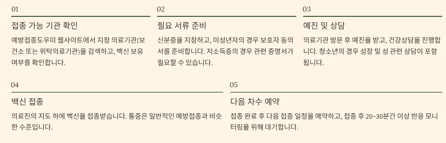 - 접종 가능한 지정 의료기관(보건소 또는 위탁의료기관) 확인 — “예방접종도우미” 사이트 활용