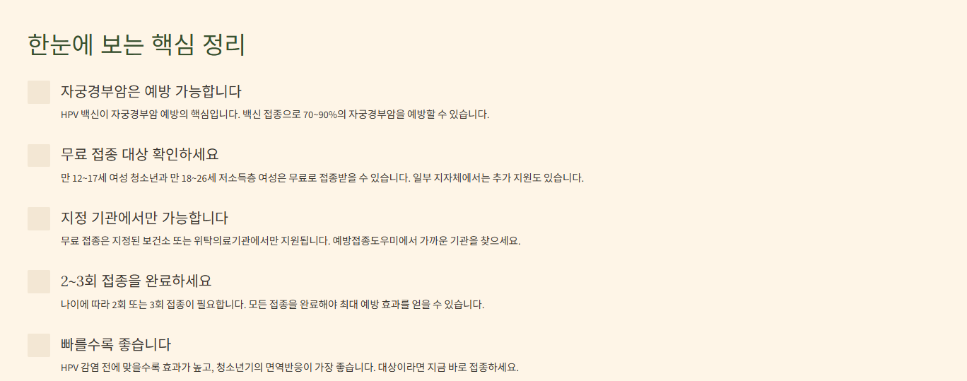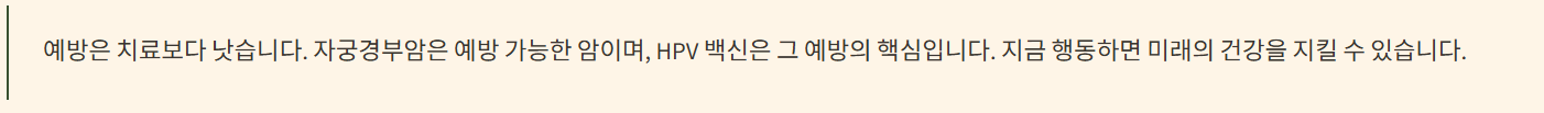 - 자궁경부암은 예방 가능한 암 — HPV 백신이 핵심입니다.