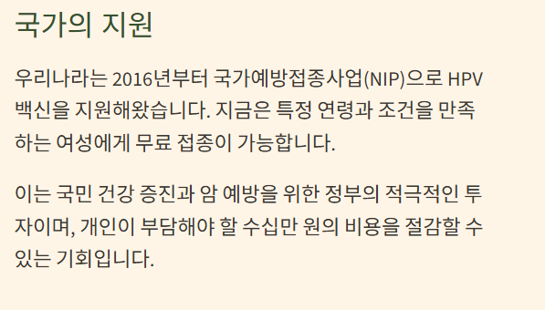 우리나라에서는 국가예방접종사업(NIP)으로 2016년부터 HPV 백신을 지원해왔고, 지금은 특정 연령과 조건을 만족하는 여성에 대해 무료 접종이 가능합니다.