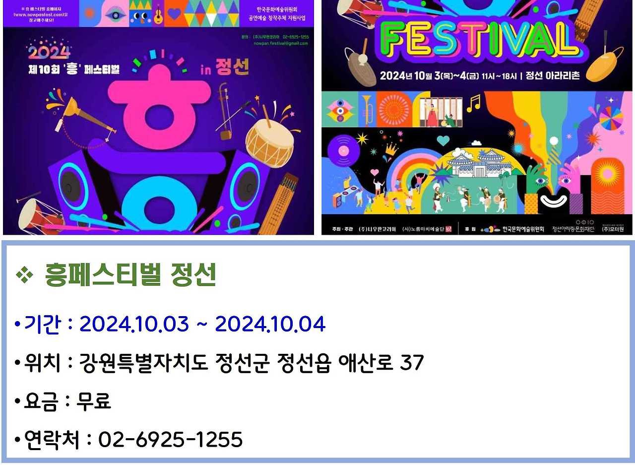 정선에서 열리는 흥 페스티벌은 2024년 10월 3일부터 4일까지 정선 아라리홀에서 개최됩니다. 이 축제는 무료로 입장할 수 있으며, 다양한 문화 공연과 체험 프로그램이 마련되어 있습니다. 홍축제는 정선의 전통 음악과 춤을 즐길 수 있는 기회로, 지역 주민들과 관광객들이 함께 어우러지는 장이 될 것입니다.