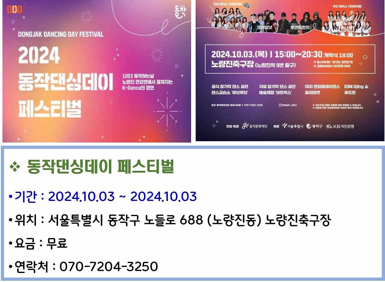 서울 노량진 스포츠 컴플렉스에서 2024년 10월 3일에 열리는 동작 댄싱데이 페스티벌은 K-Dance 문화를 체험할 수 있는 축제입니다. 이 축제는 다양한 댄스 공연과 워크숍이 진행되며, 누구나 참여할 수 있는 프로그램이 많습니다. 댄스에 관심 있는 분들에게는 놓칠 수 없는 기회가 될 것입니다.