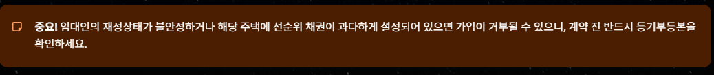 - 임대인이 세금 체납 중이거나, 해당 주택에 다수 근저당이 잡혀 있다면 가입 제한 가능