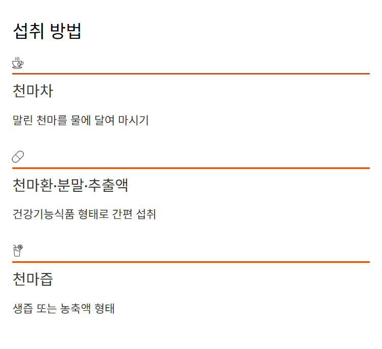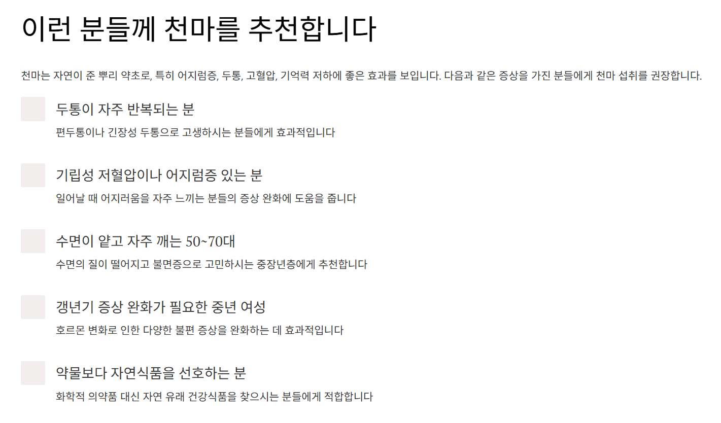 - 천마환·분말·추출액: 건강기능식품 형태로 간편 섭취