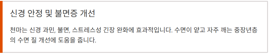- 천마는 신경 과민, 불면, 스트레스성 긴장 완화에 효과적