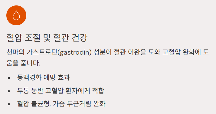 - 천마의 가스트로딘(gastrodin) 성분이 혈관 이완을 도와 고혈압 완화에 도움