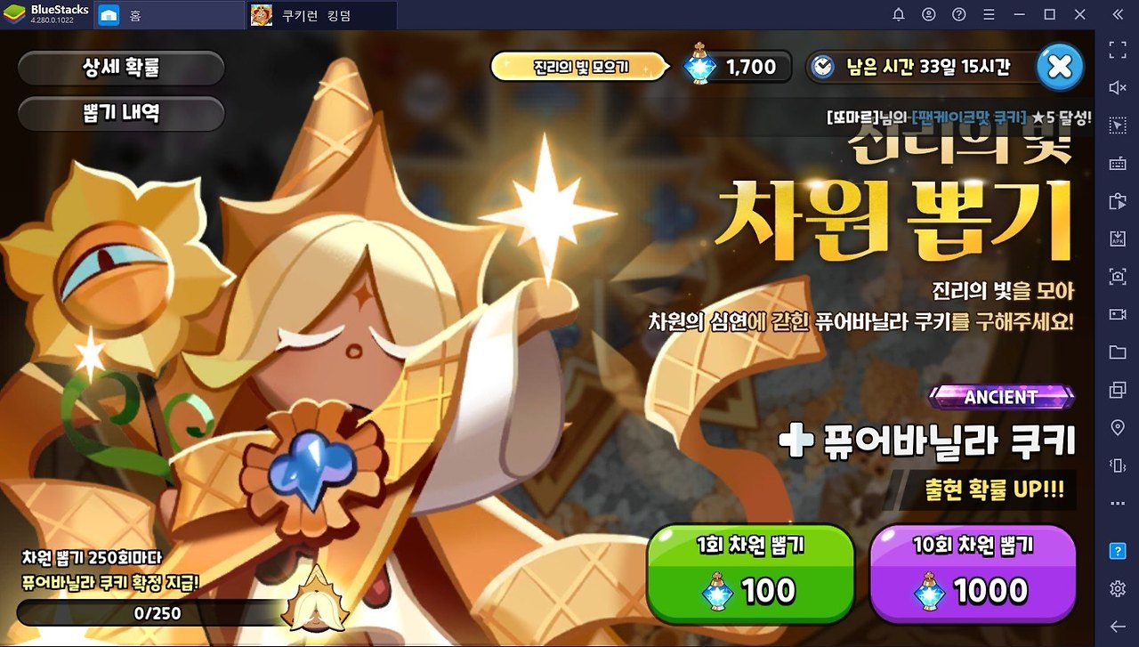 퓨어바닐라와 블랙레이즌 쿠키가 신규 쿠키로 추가되었습다. 또한 확률싸움으로 퓨어바닐라 쿠키를 뽑을수 있게 되었습니다. 퓨어바닐라는 쿠키는 신규 쿠키로 앤션트 등급의 쿠키 입니다. 가장 높은 등급의 쿠키지요. 확율일 극 저조해 많은 과금을 유도하기 위한 쿠키가 될수도 있습니다.