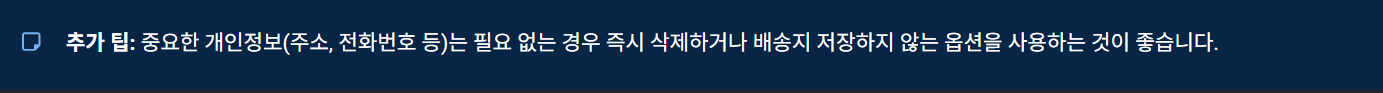 또한, 중요한 개인정보(주소, 전화번호 등)는 필요 없는 경우 즉시 삭제하거나 배송지 저장하지 않는 옵션을 사용하는 것이 좋습니다.