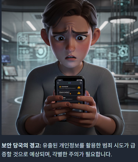 - 유출된 정보로 인해 스미싱, 보이스피싱, 신분 도용, 사기 등 2차 범죄 가능성이 커졌다는 경고가 많습니다. 정부·보안 당국도 즉각 주의를 당부했습니다.