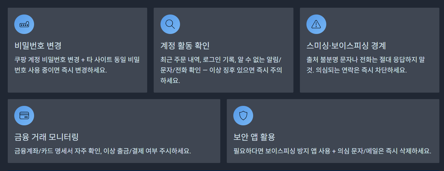 - 쿠팡 계정 비밀번호 변경 + 타 사이트 동일 비밀번호 사용 중이면 즉시 변경