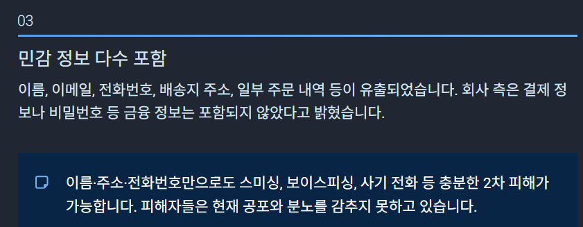 하지만 이름·주소·전화번호만으로도 충분히 2차 피해(스미싱, 보이스피싱, 사기 전화 등)가 가능하다는 점에서, 피해자들은 현재 공포와 분노를 감추지 못하고 있습니다.