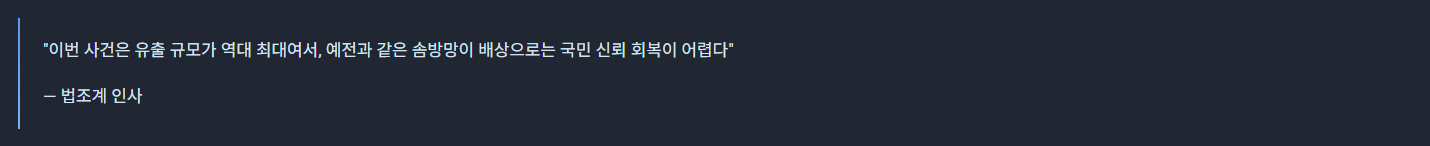 한 법조계 인사는 “이번 사건은 유출 규모가 역대 최대여서, 예전과 같은 솜방망이 배상으로는 국민 신뢰 회복이 어렵다”고 언급했습니다.