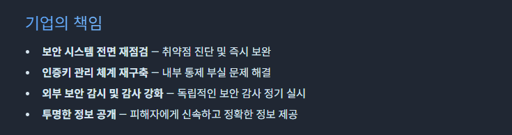 - 이번 사건은 보안 취약, 내부 통제 부실, 인증키 관리 실패 등 복합적 요인이 드러난 만큼, 기업 차원에서 보안 시스템 전면 재점검, 인증키 관리 체계 재구축, 외부 보안 감시 및 감사 강화가 필요합니다.
