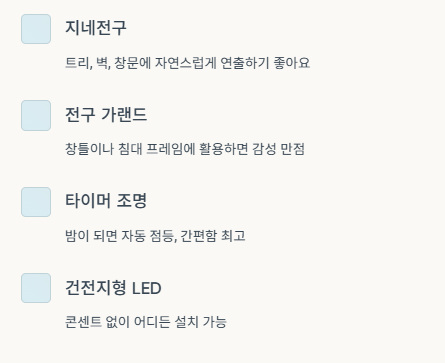 - 지네전구: 트리 or 벽, 창문에 자연스럽게 연출