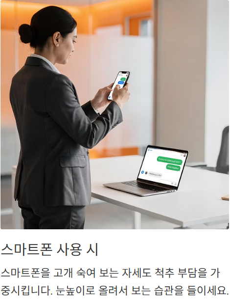 스마트폰을 고개 숙여 보는 자세도 척추 부담을 가중시킵니다.