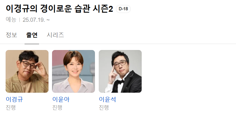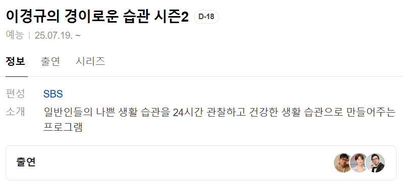| 방송 예능 | 경이로운 습관 시즌2 (7/19 첫방) |