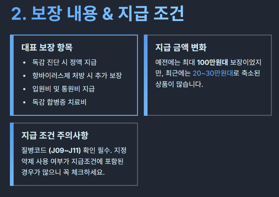 - 대표 보장 예시: 독감 진단 시 항바이러스제 처방 여부, 입원비/통원비 지급 등.