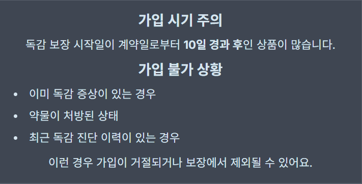 - 독감 보장 시작일이 계약일로부터 일정일(예: 10일) 경과 후인 상품 많음.