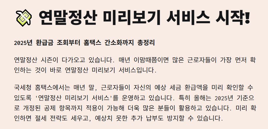 국세청 홈택스에서는 매년 말, 근로자들이 자신의 예상 세금 환급액을 미리 확인할 수 있도록