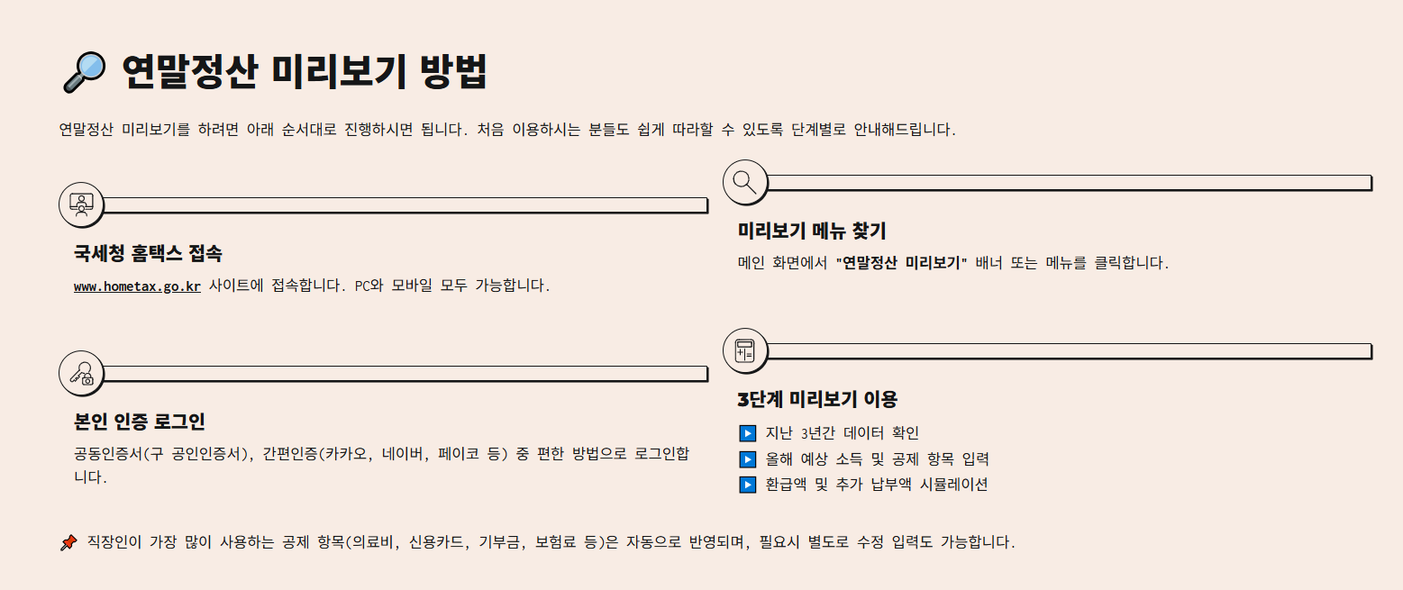 - ✔ 연말정산 미리보기는 국세청 홈택스에서 매년 10~12월 제공