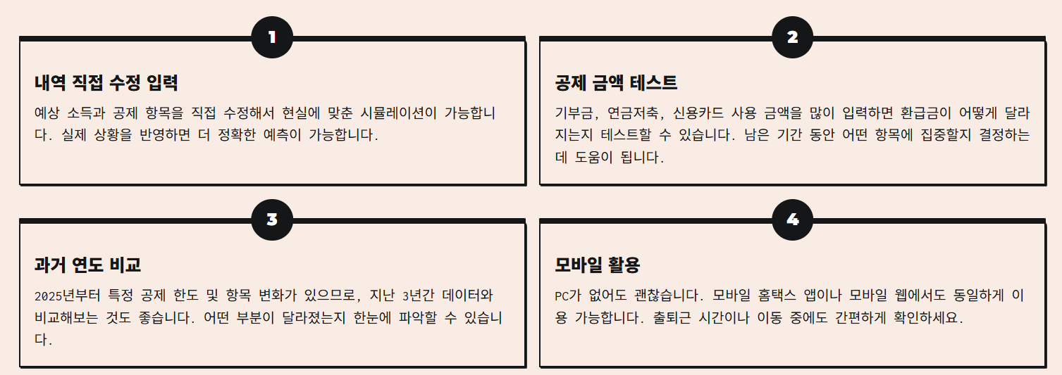 환급금이 어떻게 달라지는지 테스트 가능 - 2025년부터 특정 공제 한도 및 항목 변화가 있으므로,