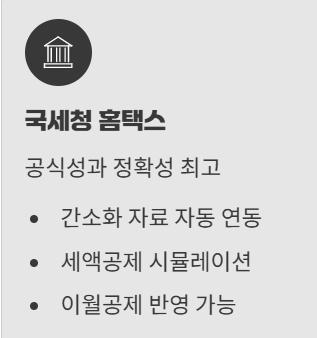 | 국세청 홈택스 | 가장 정확, 간소화 자료 연동 가능 | ★★★★★ |