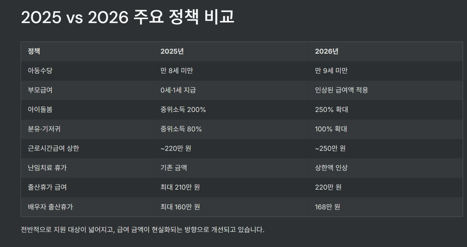 이제 2026년에 새롭게 시작되거나 **확대되는 육아 지원 제도 10가지를 한눈에 살펴보겠습니다👇