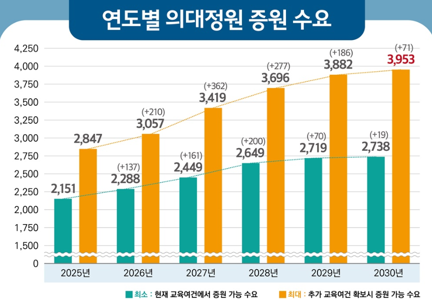 이런 상황에서 수천 명의 신입생을 추가 수용하면 교육 품질 저하, 임상실습 불균형, 기초교육 인프라 부족 등의 문제가 심각해질 수 있습니다.