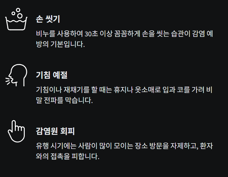 - 접종 외에도 손 씻기, 마스크 착용, 기침 예절, 공기 환기 등 기본 위생수칙 준수가 중요합니다.
