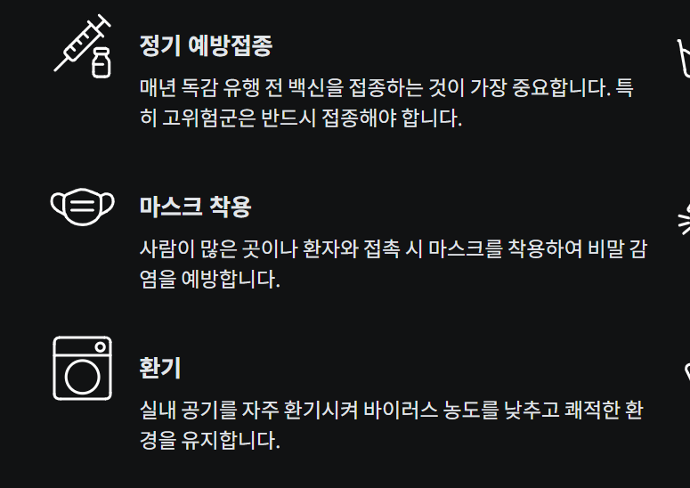 - 백신 접종 + 항바이러스제 + 철저한 위생수칙 조합이 가장 안전한 예방법.